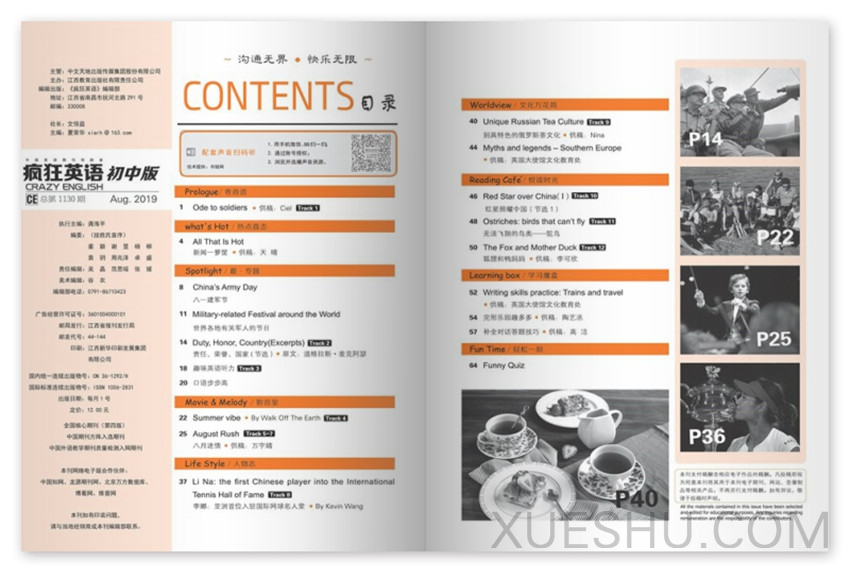 《瘋狂英語》(月刊)經(jīng)過多年的不懈努力,流行度高,大眾辨識(shí)度廣,創(chuàng)刊于1980年,開拓了視野,帶給讀者富有生活特色的內(nèi)容。時(shí)尚有趣、兼顧課堂內(nèi)外、貼近生活,適讀人群:初中生有一定英語基礎(chǔ)的學(xué)習(xí)者、12-15歲初中生等等。