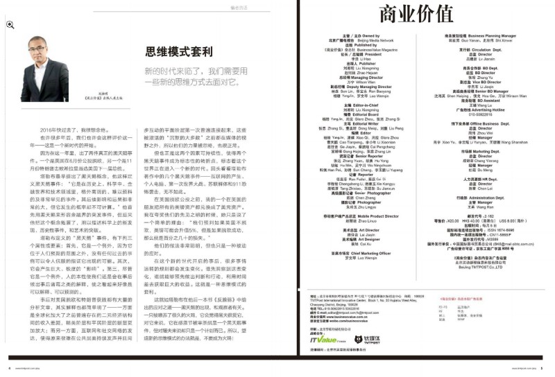 商業價值雜志是一個專注于商業領域的雜志,以發掘商業領域的價值與價值創造為核心,提供實用、科學、前沿的商業知識與經驗,幫助企業家和商業界人士規避風險、把握機遇,創造更大的商業價值。