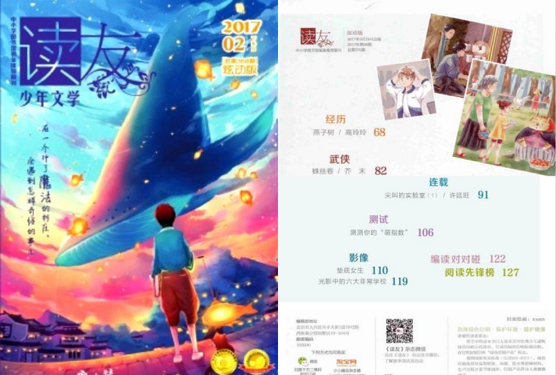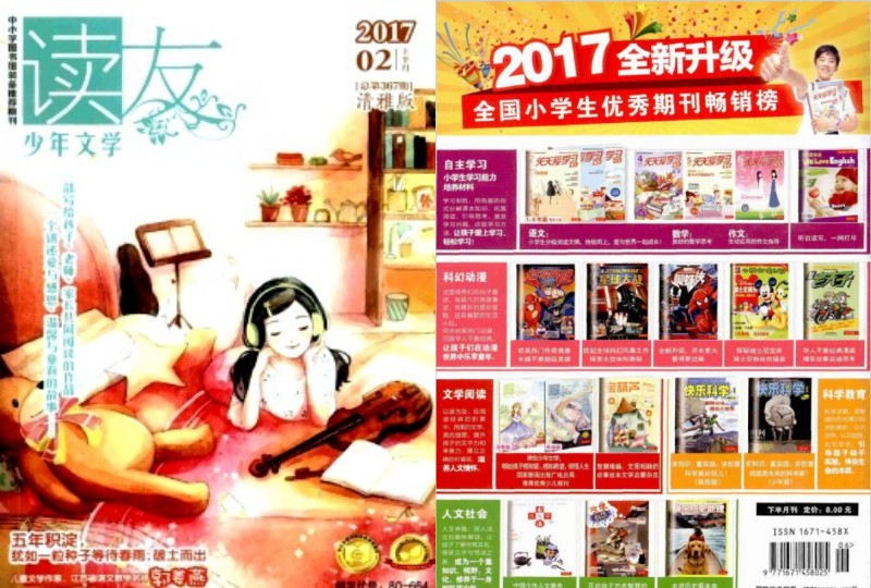 《讀友·少年文學》是一份面向8-15歲少年兒童的原創文學雜志,分為清雅版、炫動版和中長篇版三本,引領少兒文學閱讀新風尚!一本文學的刊物,有很用心的文學理想和設計,總有新作者的名字在上面閃現,她熱情地參加了養育童年閱讀的浪漫主義運動,也浪漫地培育著中國新生代的兒童文學作家。